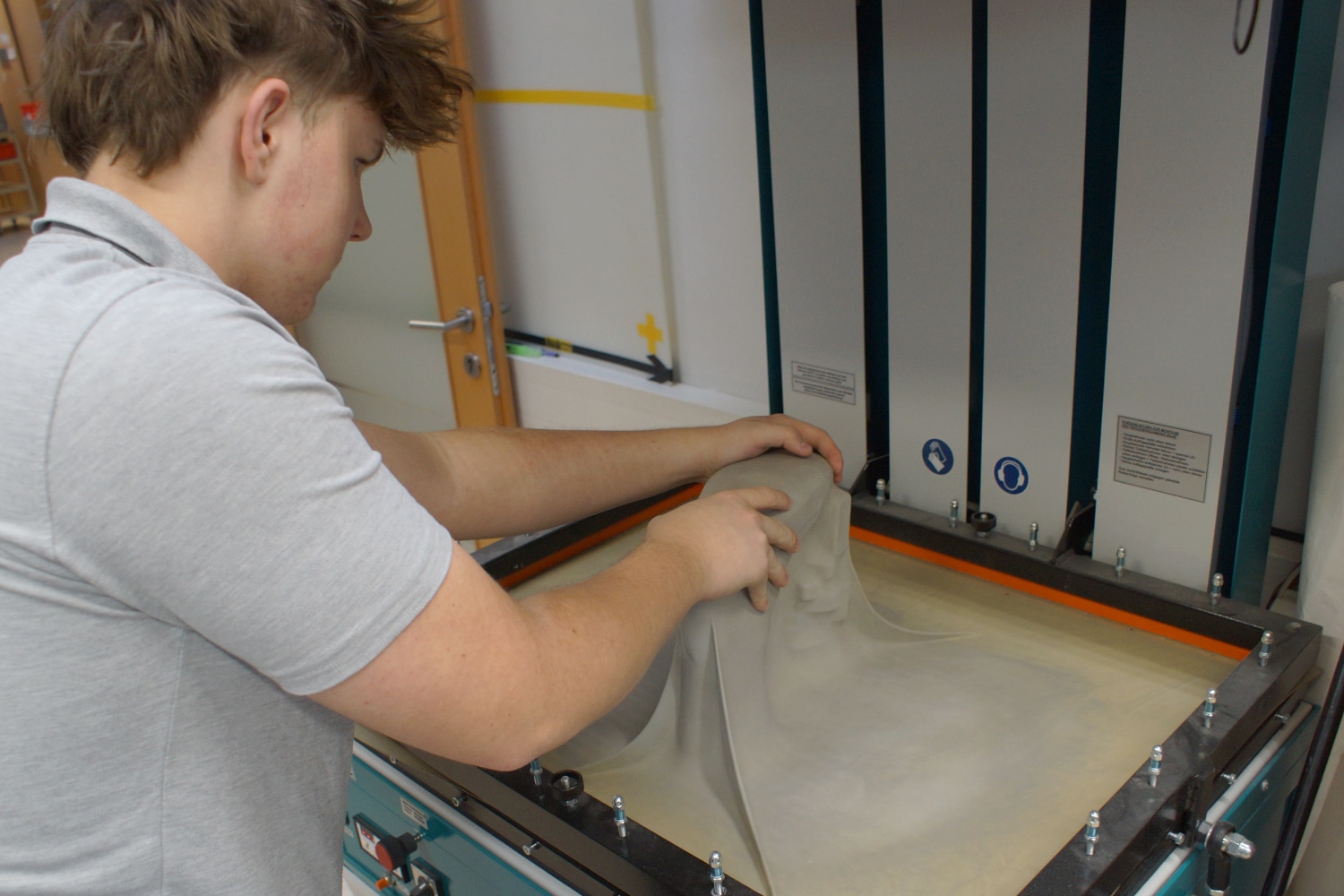 Beim Zwicken wird das Schaftoberteil über Leisten, Einlage und Brandsohle gezogen und fixiert.